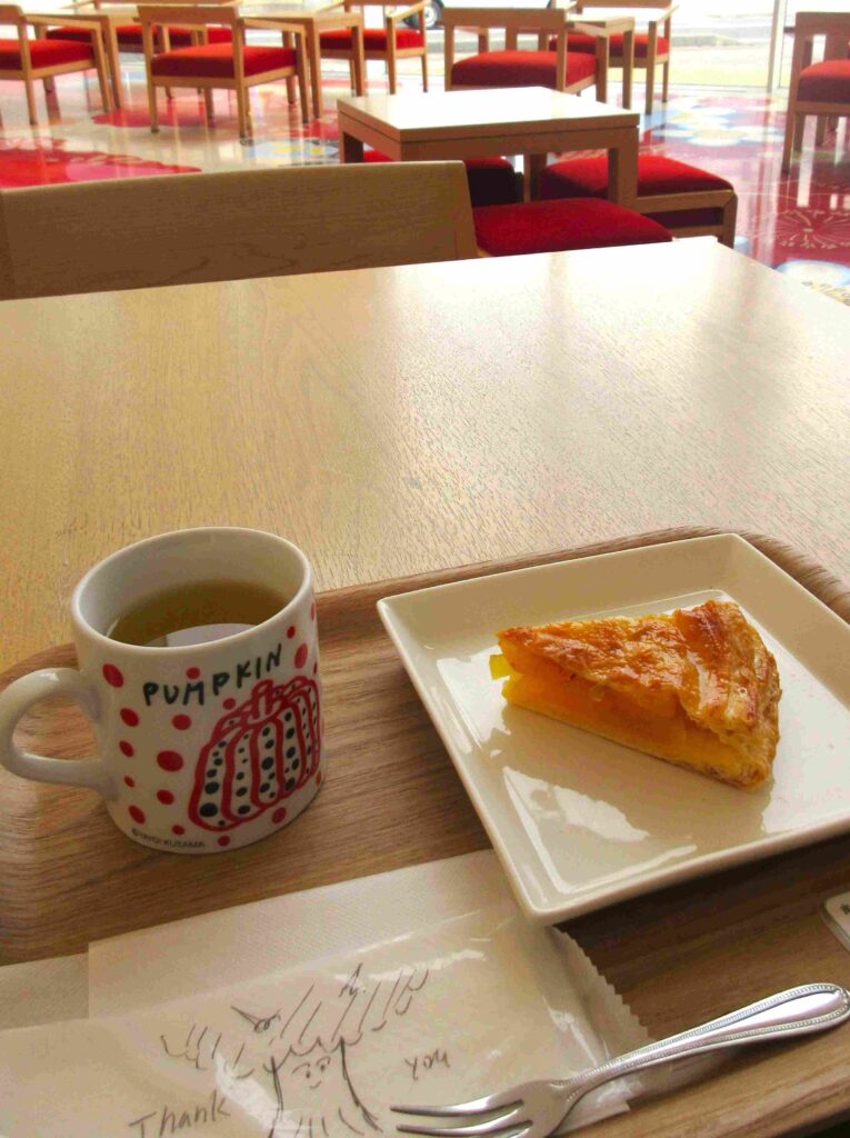 珈琲やアップルティーなどの飲み物やアップルパイ、作家さんとコラボしたスイーツや軽食が楽しめます。飲み物は、カップもかわいいです。おしぼりには、店員さんが直筆で絵を描いてくれました。美術館グッズも売っているので、お土産を探すのも楽しいです。