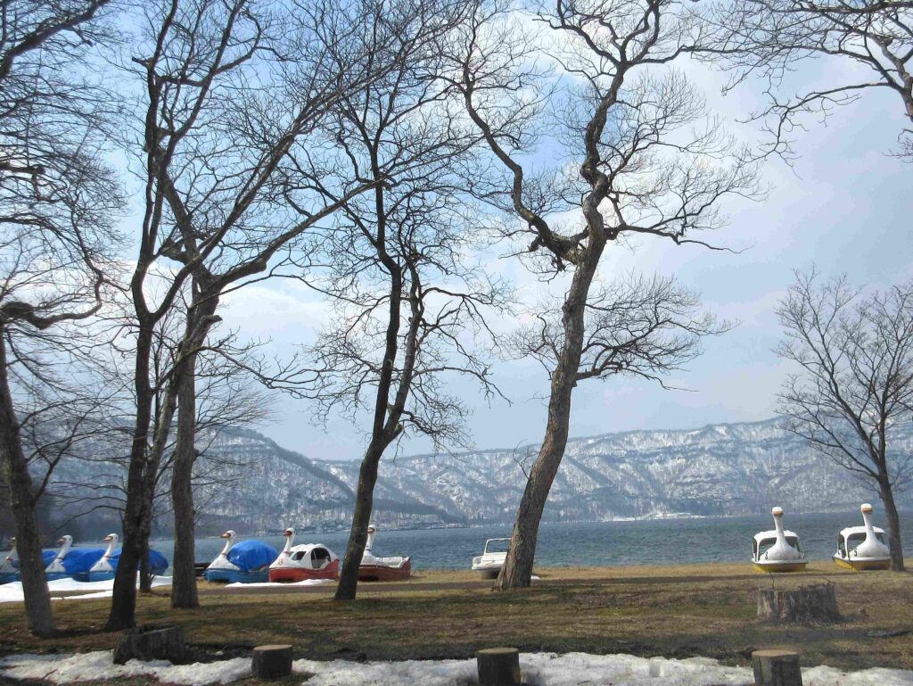 3月。まだ寒い青森の湖周辺は、観光客はおらず、もちろんキャンプやボートに乗る人も無し。というか、やっていない。カフェなどのお店も冬季休業していたりする。